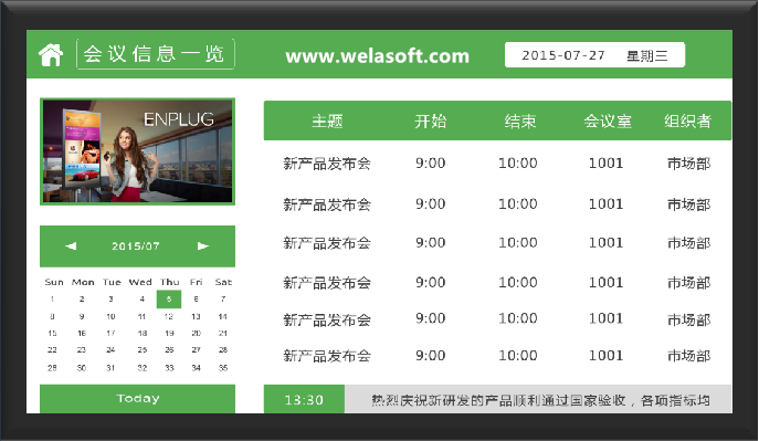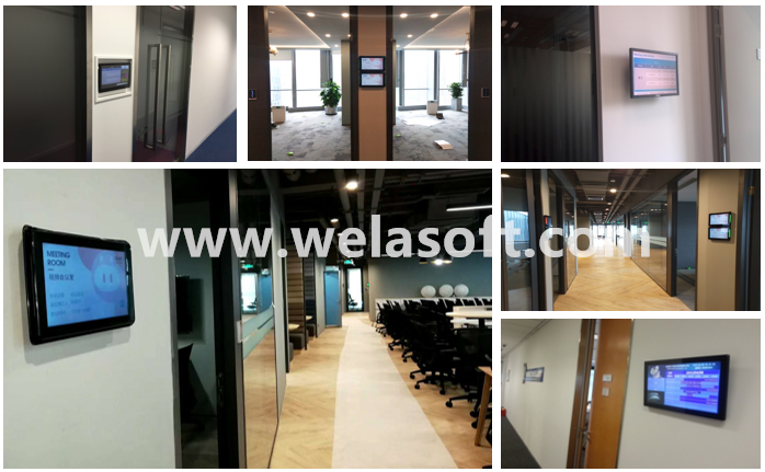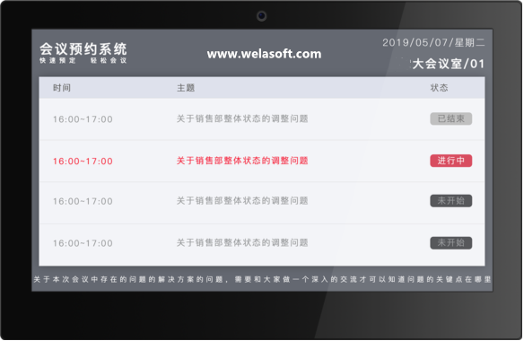 会议室门口显示:在会议室门口位置装设小屏幕显示设备,显示当前会议状态(正在开的会/空闲),已基本会议室会议日程表——会议预约屏;